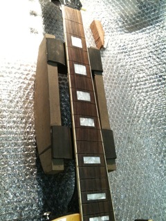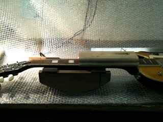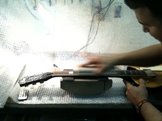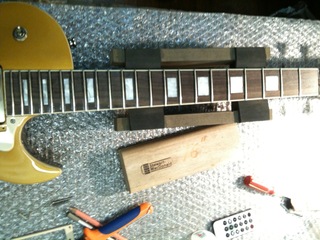 Telleri çıkarılmış olan gitarın, eski fretlerinin daha rahat sökülebilmesi ve klavyeye zarar vermemesi için sapının hafifçe geriye alırız. Çogu gitar da, teller sökülünce sap geriye doğru eğildiği için ( sap çubuğu gevştilmezse) çoğu zaman gerek kalmayabilir.bu işlem fretlerin, klavye bağlantısını bir miktar rahatlatır ve fretleri sökerken ağaca zarar vermememiz konusunda yardımcı olur. Basit ve etkili.