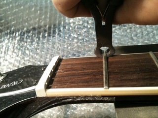 Fretler, düz kesme açılı pens ile yuvalarından kontrollü bir şekilde çıkartılır. Bu işlem yavaşça ve kontrollü bir biçimde gerçekleştirilmelidir, aksi takdirde klavyeden parçalar kopabilir. Bu yüzden ağır adımlarla, pensi yukarı çekerek değil hafifçe aşağı bastırarak fretler sökülür.