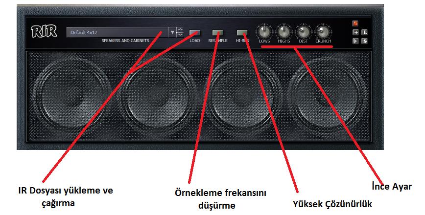 Anfi+cabinet+Mic equ ve Distortion ayarları : Burada impulsela yüklediğiniz sistemin Bass,Tiz, Distortion ve Crunch ayarını yapıyorsunuz.