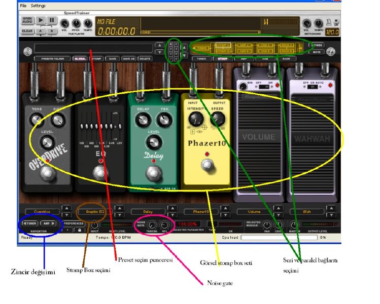 Modül seçim butonu: Buraya tıkladığınızda programda kullanacağınız tüm stomp boxlar,pedallar, cabinetler, anfiler, mikrofonlar ve rack sistemleri seçim menüsü açılır.