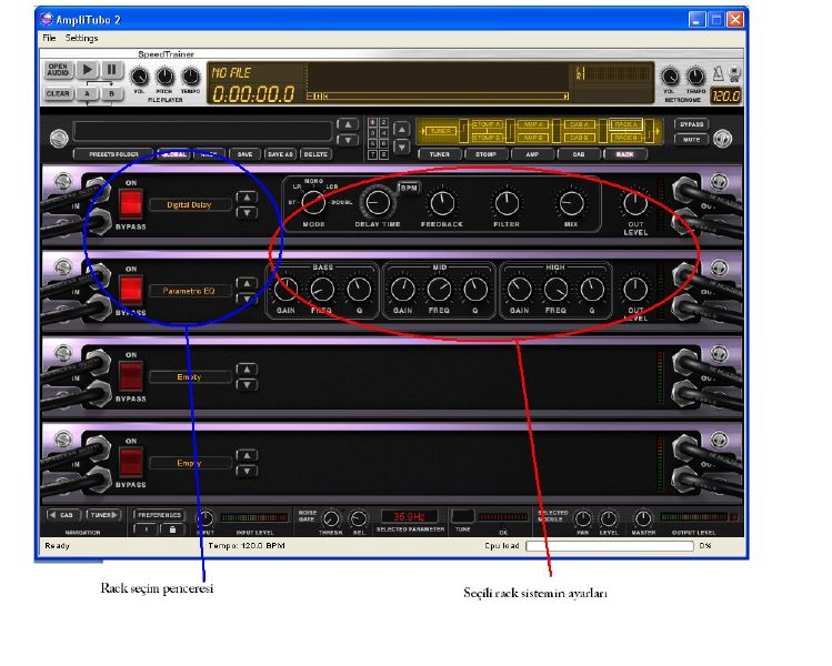 VST prog. açma kısmı: Bu butona tıkladığımız zaman o an yüklü olan VST programının arayüzü açılıyor ve istediğimiz tüm ayarları o programdan yapıyoruz. Önemli : Zincirimizin doru çalışması için yüklenen VST host programındaki odüllerin istediğimiz kadar olmasına dikakt edin. Çünkü Amplitube 2 yi eklediğiniz zaman tüm anfiler ve cabinet modelleri açık olacaklar ve bunları bypass yaparak kapatmalı sadece ekleyeceğimiz modülleri