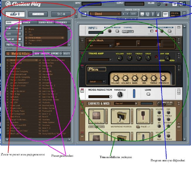 Zincir ve preset arası geçiş Penceresi: Buradaki en sağda görünün kısma tıklarsanız preset pencereleri açılır ve mor renkle belrttiğim kısımlar belirir. En sağdaki kısım programın pencere boyutunu ve Rig Kontrol cihazının tanıtılmasına yarayan kısımdır.
