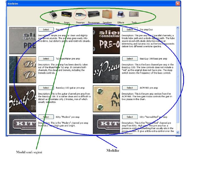Modül sınıfları seçimi kısmı: Burada amplifier ları, distortion pedallarını , equ ayarlarını kısacası tüm modülleri sınıf sınıf görebilir ve işinize yarayanları seçebilirsiniz.