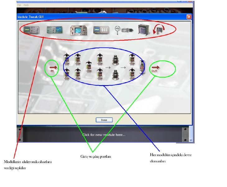 Tüm modüllerin Yerleşimi : Bu kısım tüm modüllerin seri ve paralel yerleşimi tek pencerede yer almaktadır. Her ayar kendi modülünden yapılmakta ayrıca sağ tıklanarak modülün ayarı kaydedilebilmektedir. Önemli : Her modülün bir de advance bias ayarı vardır, bu ayarlar gerçek hayattaki cihazlarda bulunmamakla beraber programdan daha düzgün ses alabilmeniz için her modüle ince ayar yapmanıza olanak verir.