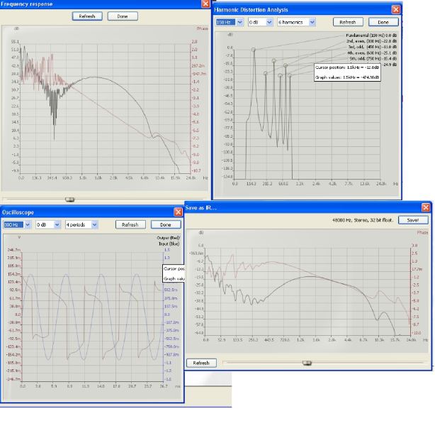 Yukarda Frekans Tepkisi aracı o modülün frekansının değişimi ile kazancının ne kadar değiştiğini görmektesiniz. Burada refresh tuşuna basılırsa ve gitar çalınırsa o anki frekasn tepkisi anında çizilir ve saklanır. Harmonic Distorsiyon analizöründe distorsiyon bozulmaları nın grafiği yer alır burada frekansa göre bozulmalar görebilmekte size uygun olana göre harmonic sayısını o anki duruma göre ayarlayabilirsiniz. Osiloskop ise zaman düzleminde basit bir sinüs darbesinin o modülün çıkışında nasıl göründüğünün grafiği görülmekte. Dave as IR ise Impulse yanıtının saklanmasını sağlamakta.