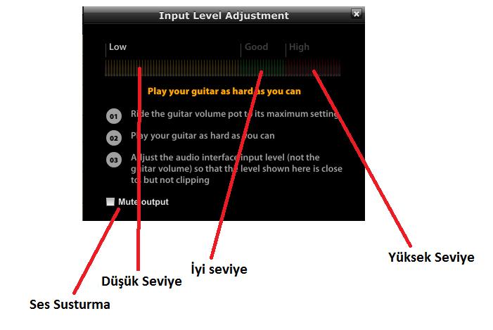 Eğer ses seviyesi Düşük seviyede kalırsa Input Seviyeniz gitar amfisi kullanımına yeterli değildir ve ses kartınızın ya da preamp’ ınızın seviyesini arttırmanız gerekir. Eğer Ses seviyesi yüksek seviyeye gelirse tersini yapmalısınız. Sesi sarı alanda ya da kısmızı alanda değil yeşil alanda tutmanız gerekir.